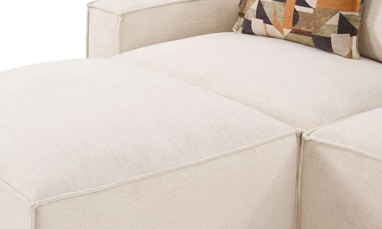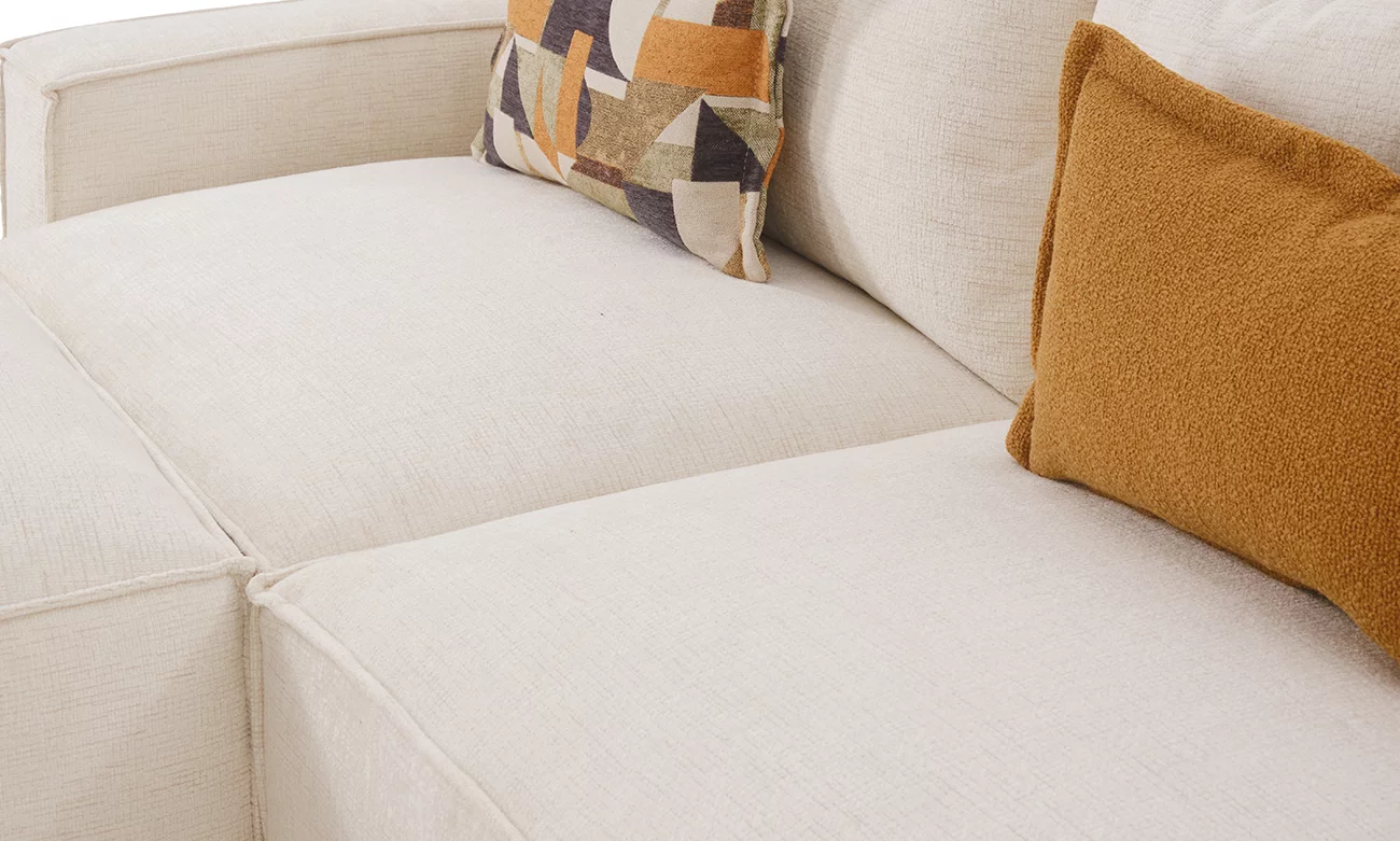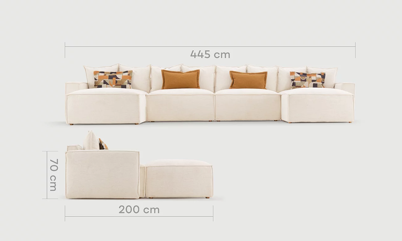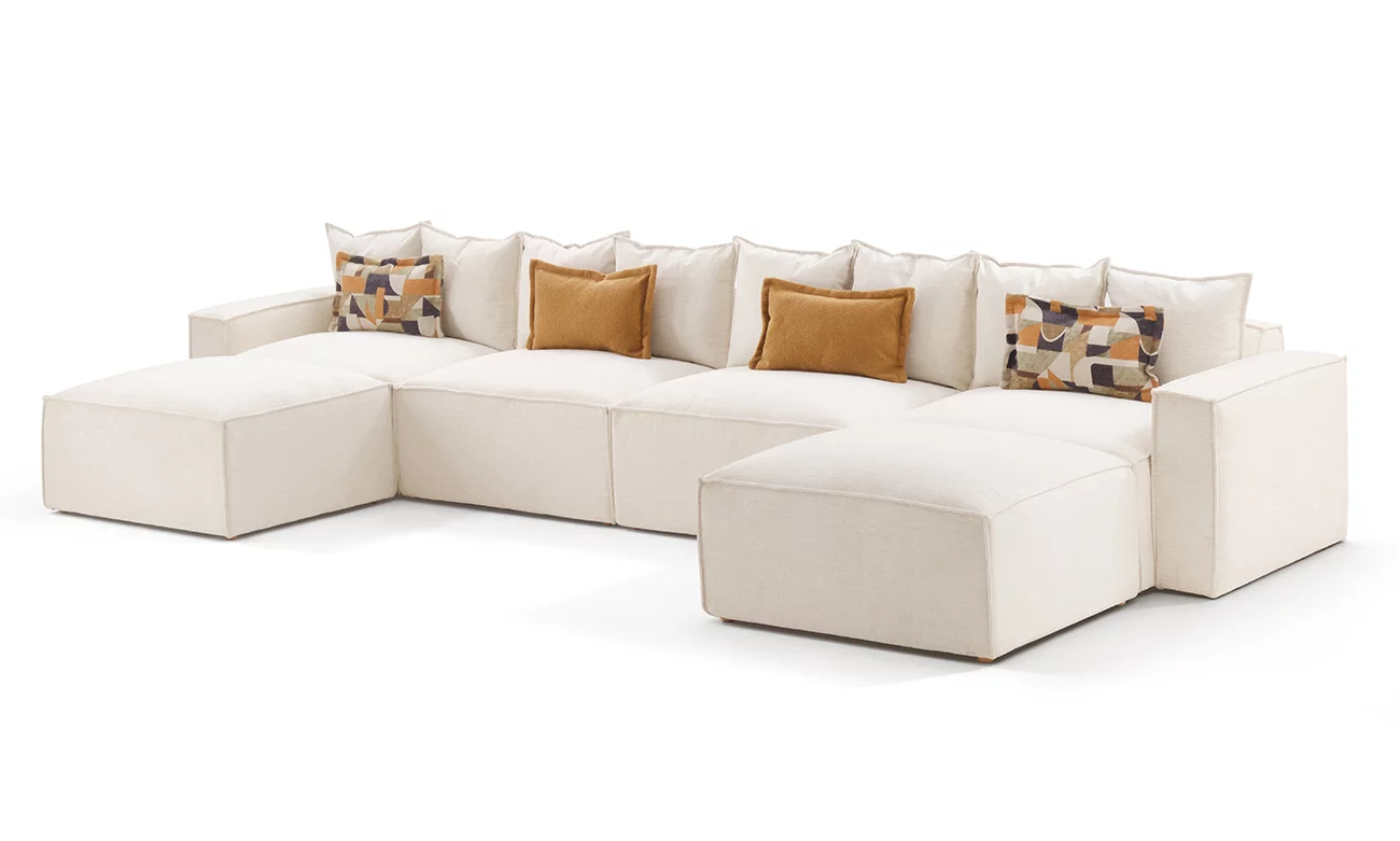 Le salon en U Brooklyn PM d’ErraouiDecor redéfinit les standards du luxe et du confort pour votre espace de vie. Construit sur une structure en bois massif, il garantit une solidité exceptionnelle tout en assurant un maintien optimal grâce aux sangles élastiques entrecroisées. Son rembourrage en mousse HR35 italienne, enrichi d’une couche de mousse mémoire et de plumes de canard, procure une douceur et une sensation d’enveloppement incomparables. Revêtu d’une toile traitée anti-taches, le Brooklyn PM reste élégant et impeccable, même face aux exigences du quotidien.