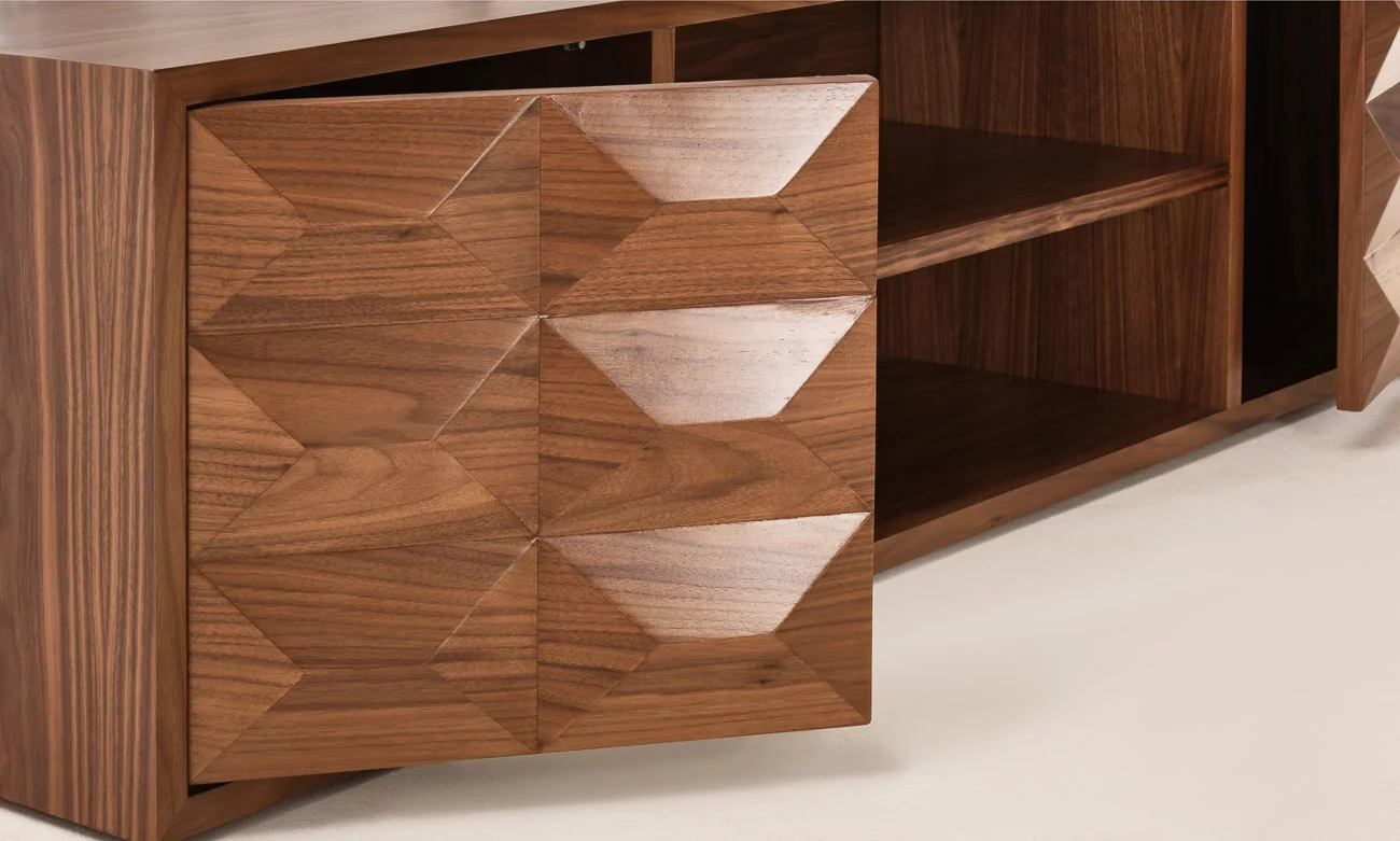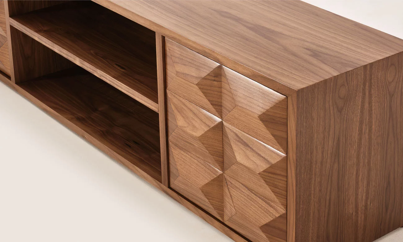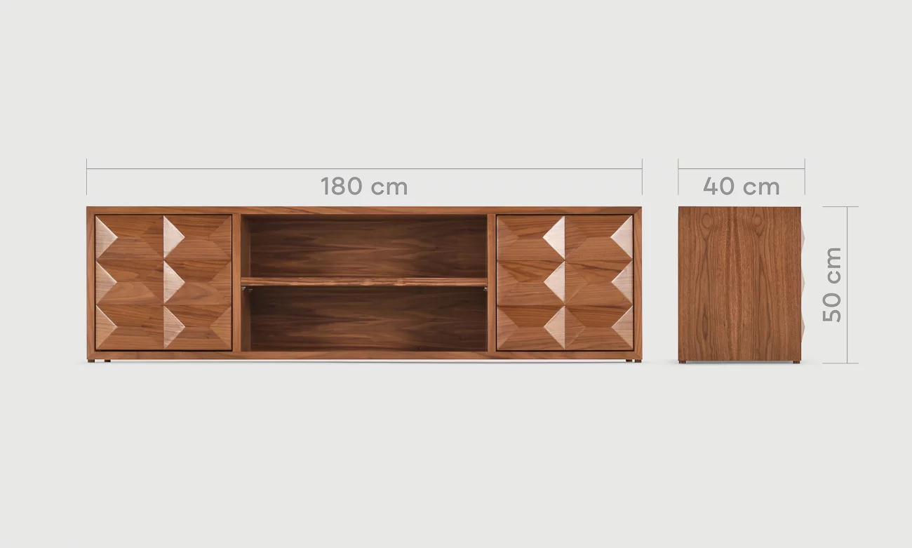 Conçu en bois massif plaqué noyer, ce meuble télé allie solidité et esthétique épurée, ajoutant une touche sophistiquée à votre intérieur tout en optimisant l’organisation de votre espace de vie.