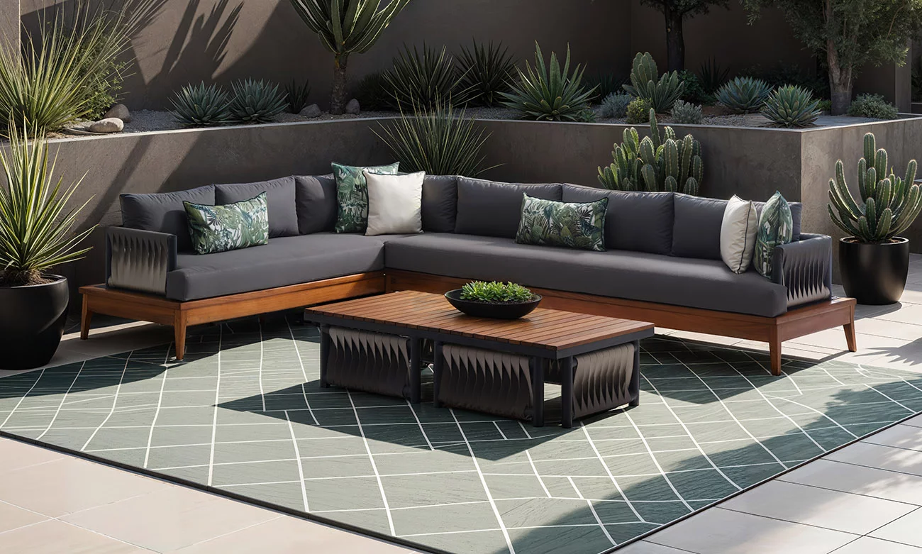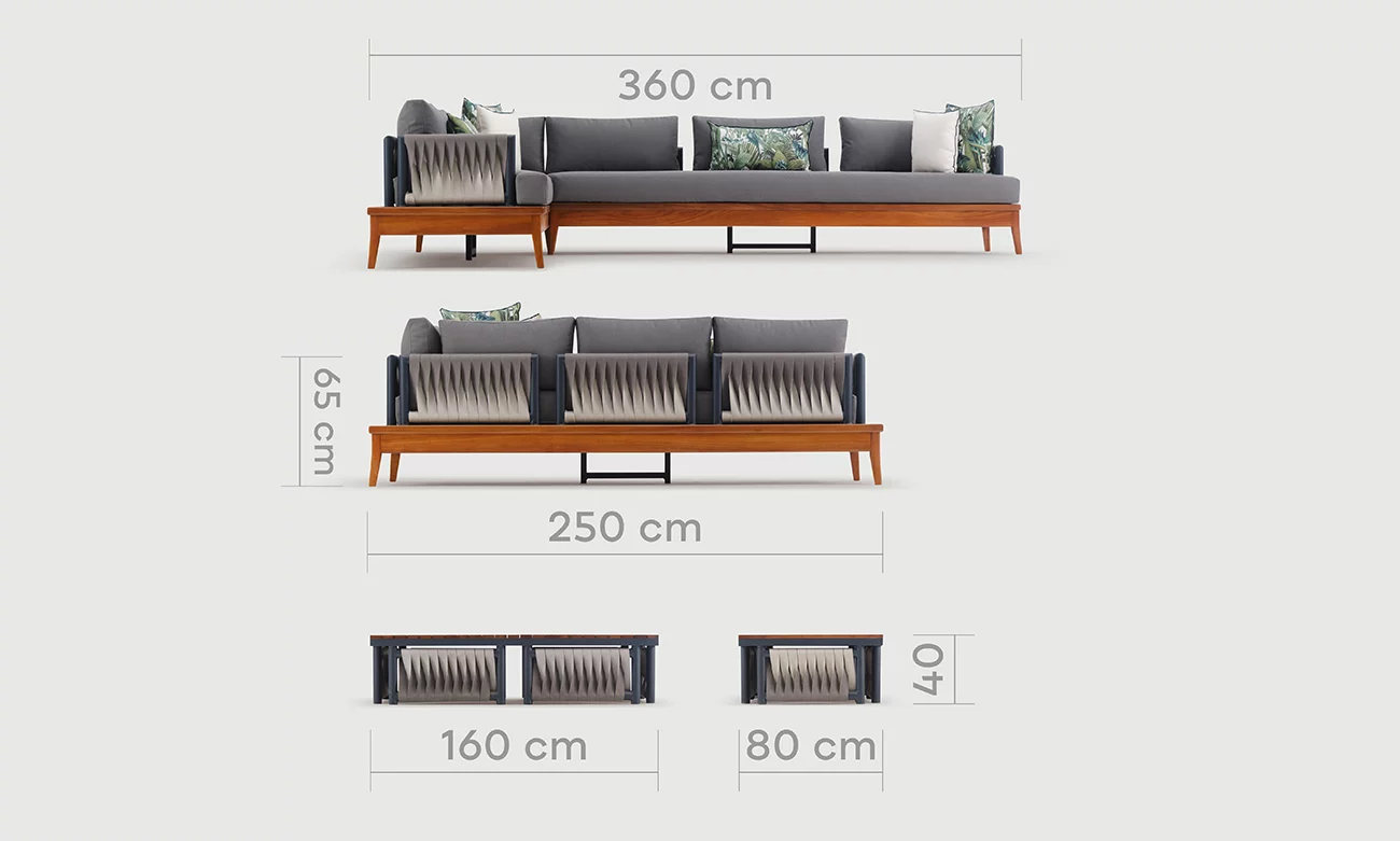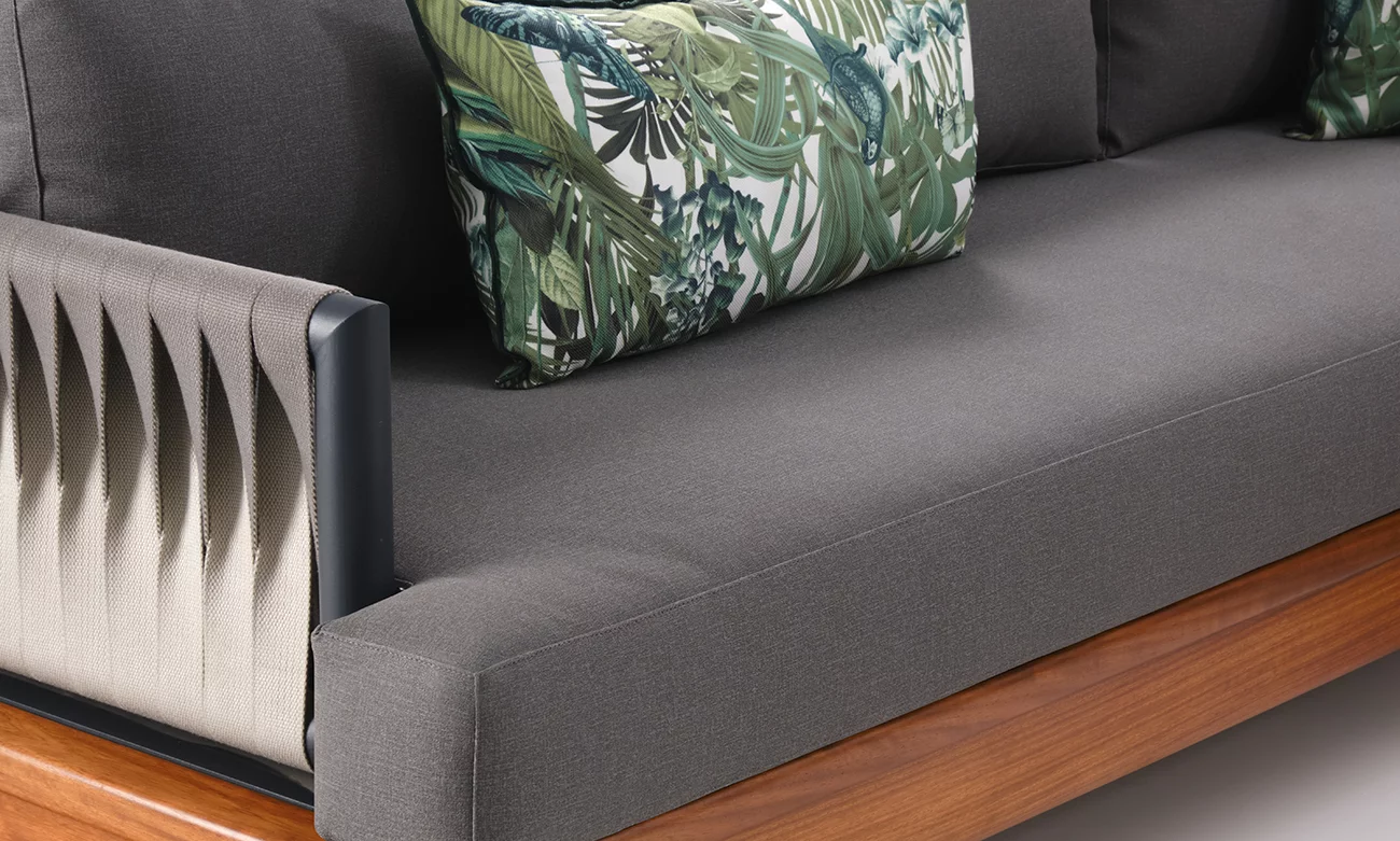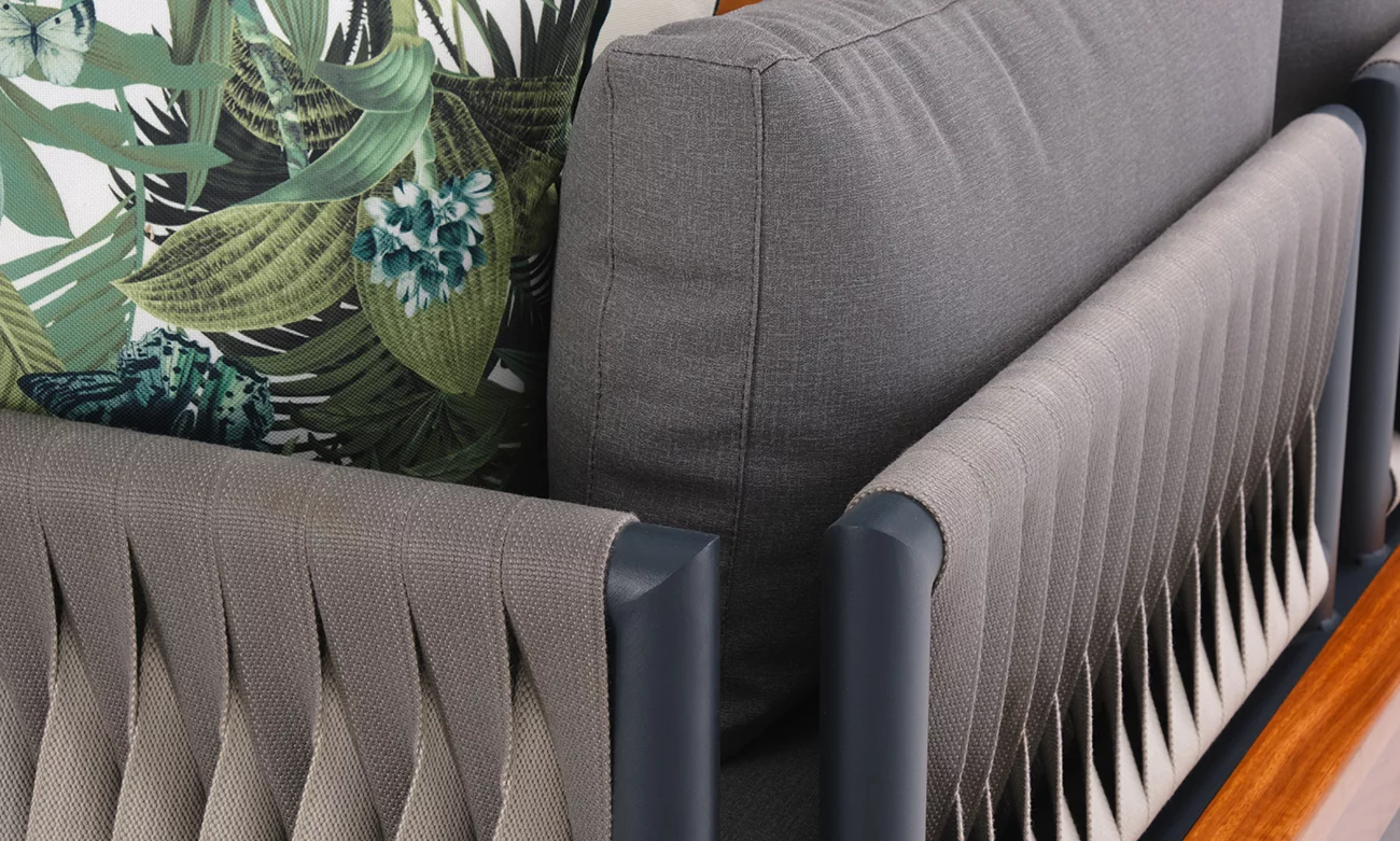 Le salon d’extérieur en L Marbella incarne l’équilibre parfait entre confort et sophistication. Sa structure en bois d’Irokko, associée à des éléments en aluminium et des cordes élégantes, offre une robustesse inégalée et un style contemporain.