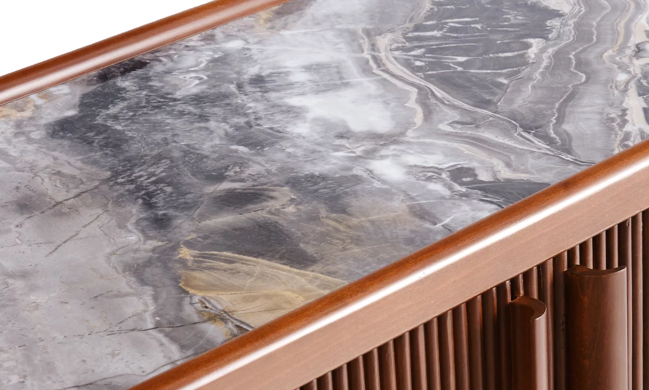 Le plateau en céramique ajoute une note de sophistication moderne, tandis que les pieds en hêtre massif teinté noyer apportent une stabilité élégante. Polyvalent et stylé, le Buffet Sorento est la pièce idéale pour enrichir votre intérieur avec distinction et praticité.